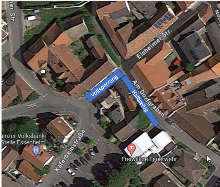 Wegen Abrissarbeiten ist die Elsheimer Straße zwischen Feuerwehrparkplatz und Am Dorfgraben vom 15. – bis 19. Januar 2024 vollgesperrt. Der Dorfgraben ist halbseitig gesperrt. Eine Umleitung ist ausgeschildert. Sie führt über Mainzer Str. – Ostertalstraße – In den Domherrngärten – Nieder-Olmer Straße – Am Römerberg.