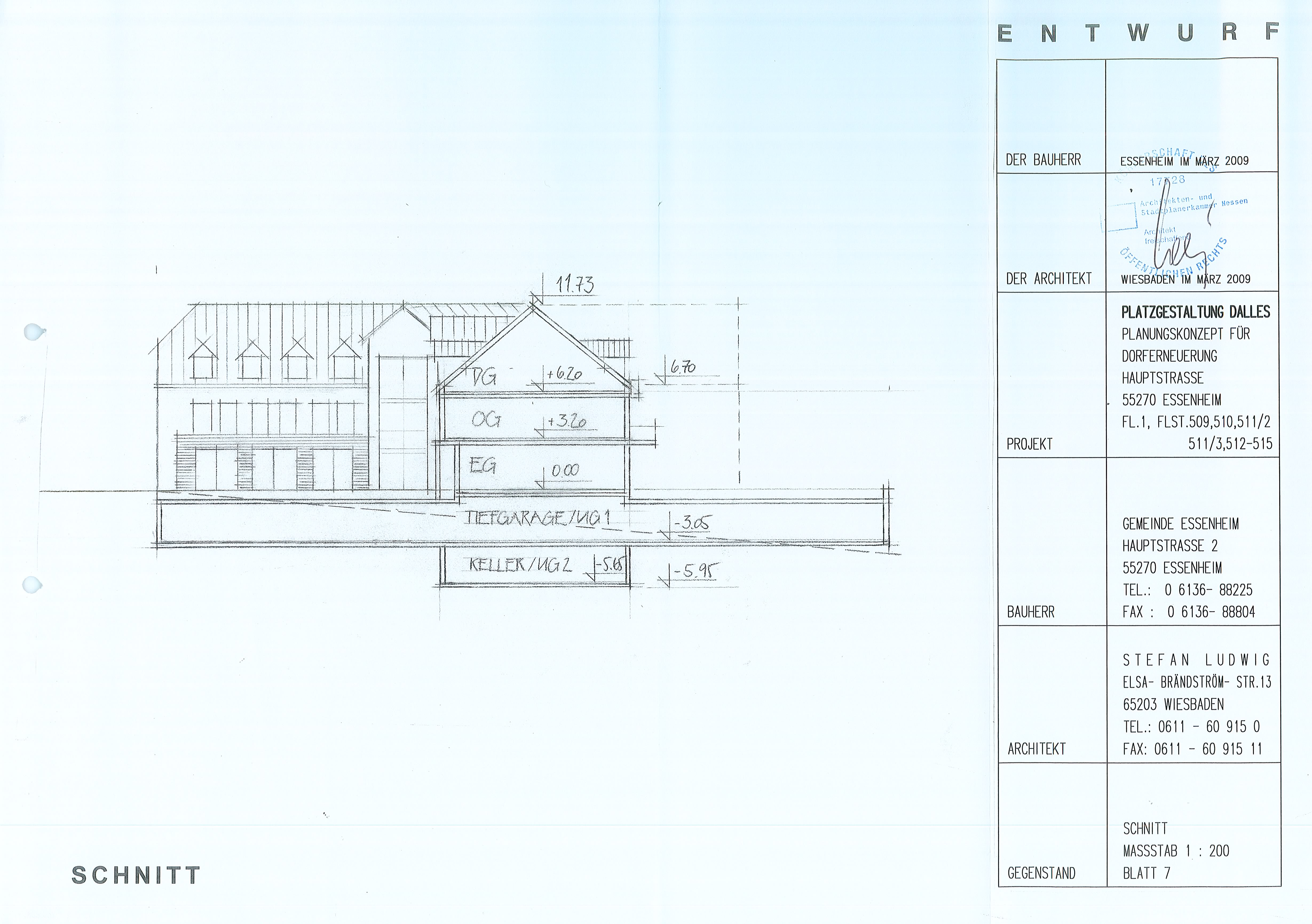Eine frühe Planungsstudie des Wiesbadener Architekten Stefan Ludwig sah die Ausbildung einer Tiefgarage unter dem gesamten L-Baukörper vor. Über dem Gewerbeteil im EG, mit zwei Gastronomie-Einheiten, sollten in zwei Geschossen 12 Wohneinheiten entstehen. Eine Begrünung der Platzfläche war nicht Teil der Planung, in die heutige Sichtachse ins Tal stellte sich der massive Baukörper.